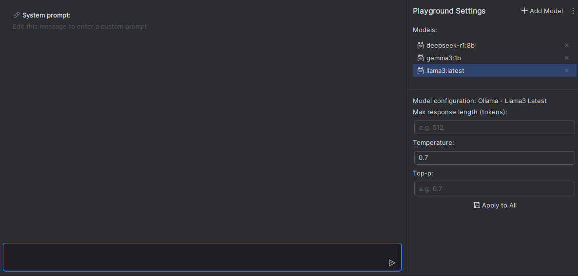Per integrare Ollama con AI Playground, ti basterà aprire Pycharm, cliccare sulla sinistra nel menu “AI Playground” e seguire questi passi: