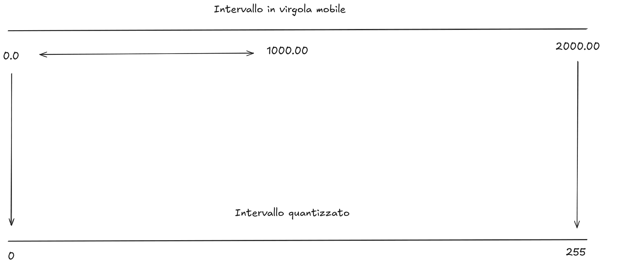 Immaginiamo quindi di voler mappare un insieme di numeri in virgola mobile che va da 0.0 a 1000.0 utilizzando un range di valori rappresentabili con 8 bit. Con 8 bit, possiamo rappresentare 256 valori distinti (da 0 a 255). Per mappare il nostro intervallo di numeri in virgola mobile (0.0 a 1000.0) ai valori rappresentabili con 8 bit, dobbiamo calcolare il fattore di scala, così che il numero 0.0 nella notazione in virgola mobile corrisponda al valore 0 in notazione a 8 bit, e il numero 1000.0 corrisponda al valore 255 in notazione a 8 bit.