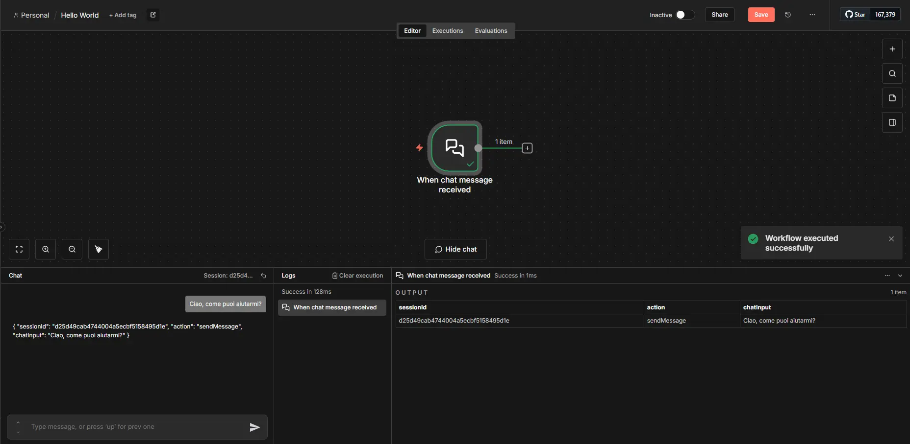 Il trigger non solo fa partire il workflow, ma porta con sé gli argomenti della funzione: nel caso del Chat Trigger, il messaggio dell’utente e il suo Session ID.