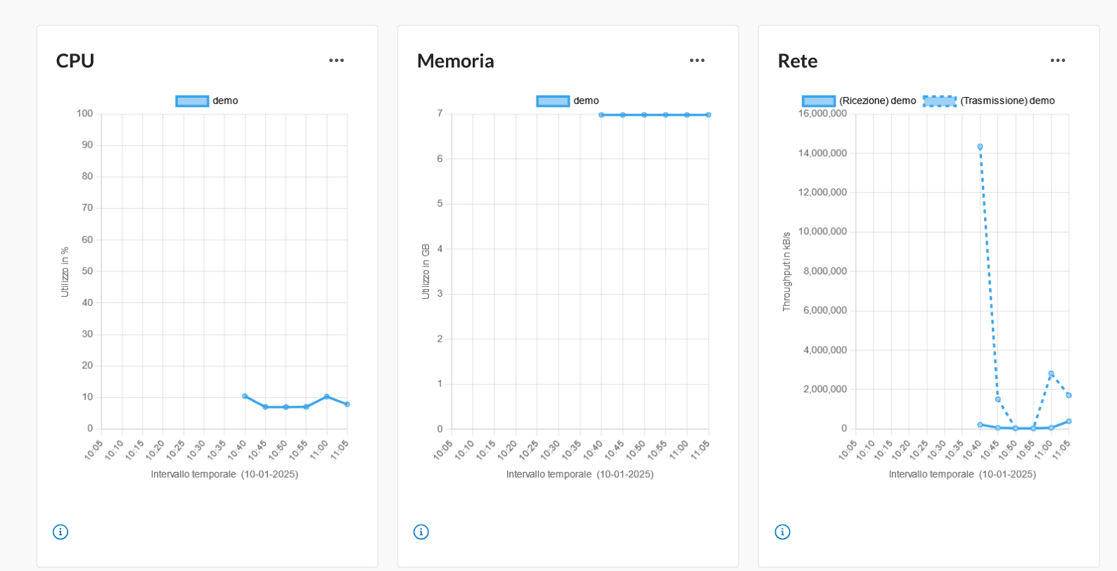 La cosa interessante è la possibilità di visualizzare anche i consumi delle risorse di questo cluster: andando sulla dashboard Aruba, nella sezione di Monitoraggio del cluster Kubernetes, vediamo che i dati relativi a CPU, memoria e traffico di rete: