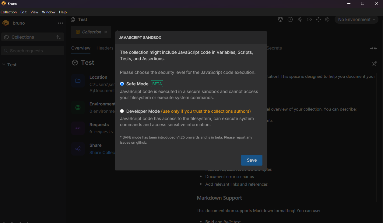 Altro aspetto interessante riguarda l’utilizzo di un ambiente sandbox per definire il livello di sicurezza per l’esecuzione del codice: Bruno offre due opzioni per eseguire il codice in un ambiente isolato, ossia la modalità safe, che impedisce l’accesso al filesystem o l’esecuzione di comandi, e quella da developer, dove questi permessi sono invece concessi. Questo consente agli sviluppatori di eseguire Bruno in modo sicuro, senza rischiare di compromettere il sistema o i dati sensibili.