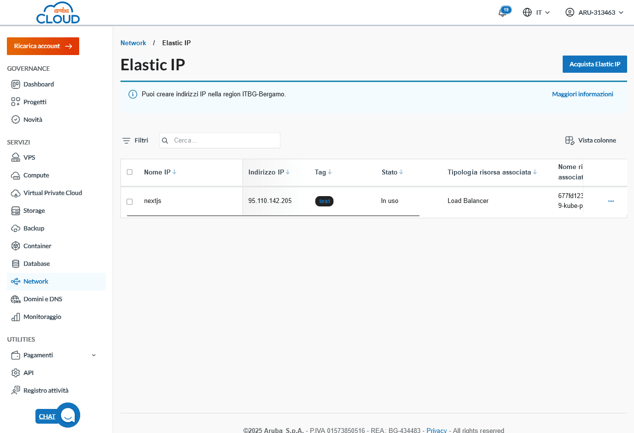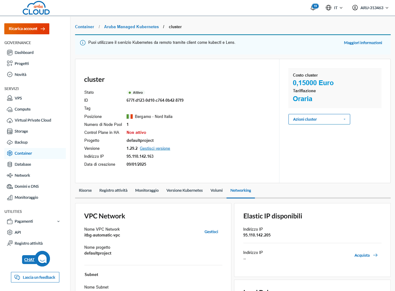 Per farlo, torniamo sul dettaglio del cluster nella dashboard di Aruba Cloud e selezioniamo la sezione networking: