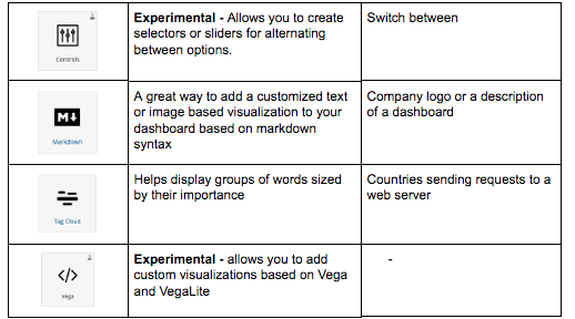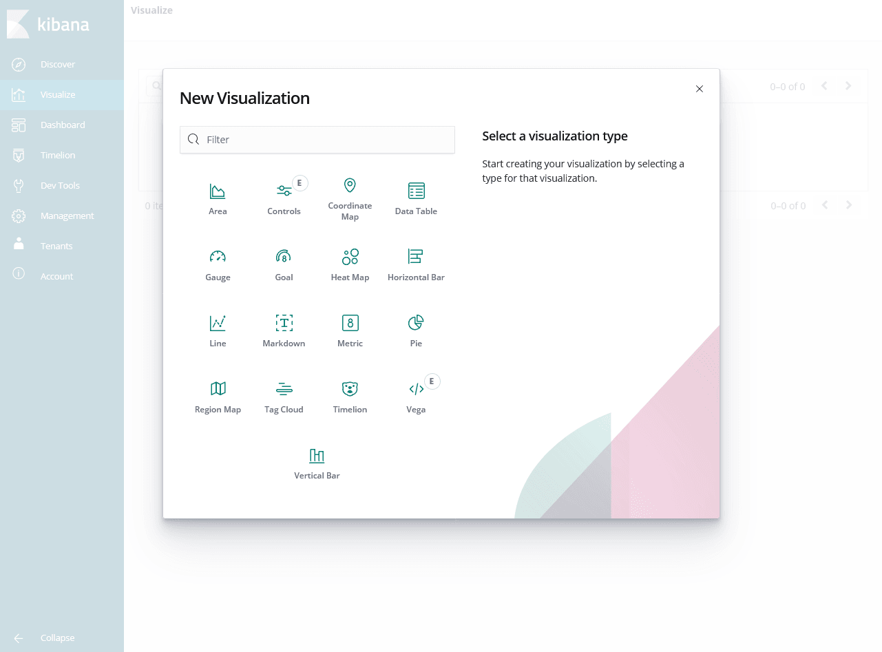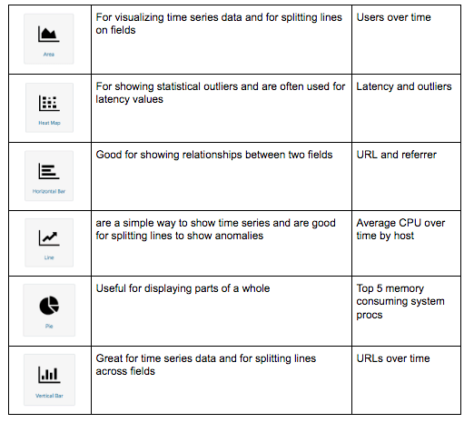 Cliccando sul pulsante “Create a visualization”, verrà mostrato l’elenco dei tipi disponibili in Kibana: ogni tipologia può essere usata in determinati contesti, come nel caso dei grafici che sono perfetti per mostrare dati di frequenza e consumo delle risorse.