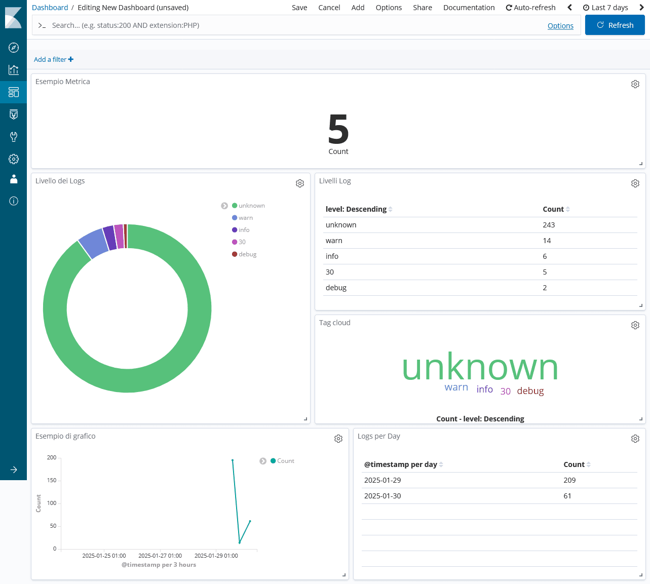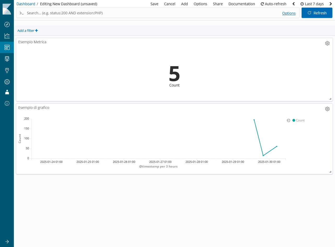 Una dashboard in Kibana è un’interfaccia visiva che consente di raccogliere e visualizzare dati provenienti da Elasticsearch in modo interattivo e dinamico. Le dashboard possono integrare tutte le visualizzazioni finora create e, soprattutto, permettono di aggiornarle in tempo reale sfruttando la barra di ricerca di Kibana che permette di filtrare i risultati.