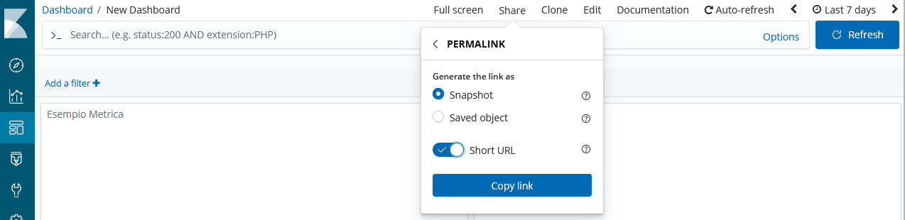 Una volta create le visualizzazioni o le dashboard desiderate, Kibana offre diverse opzioni per condividerle. Gli utenti possono integrare questi elementi all’interno delle proprie applicazioni web tramite il tag oppure condividendo il link per permettere l’accesso ad altri utenti.
