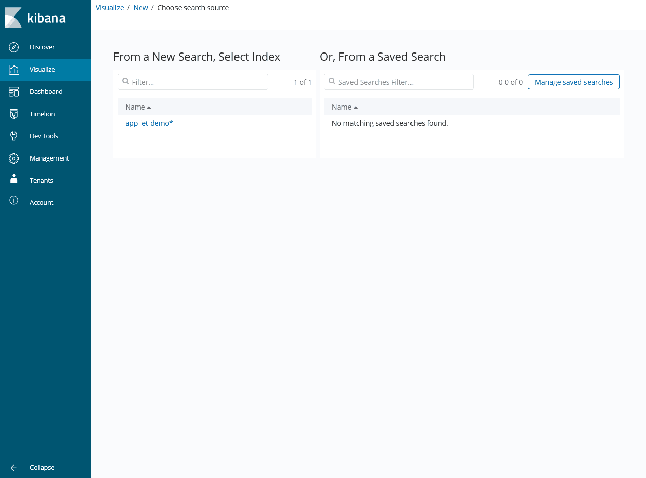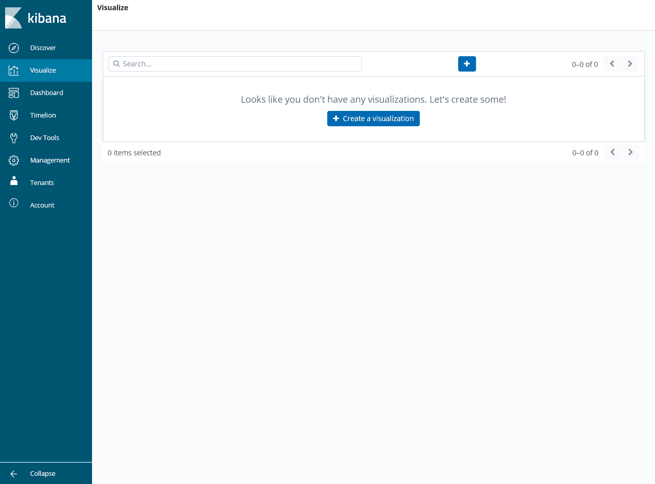 Cliccando sul menù di sinistra, alla voce “Visualize”, è possibile aprire l’elenco delle visualizzazioni disponibili (attualmente vuoto):