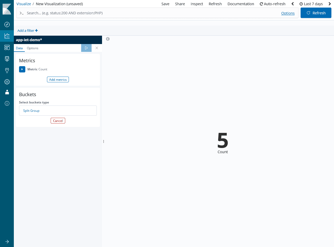 Immaginiamo di voler mostrare tramite un contatore il numero di log prodotti nelle ultime 24 ore: dall’elenco delle visualizzazioni selezioniamo, ad esempio, “Metric” e poi selezioniamo l’indice di interesse (o una ricerca precedentemente salvata.