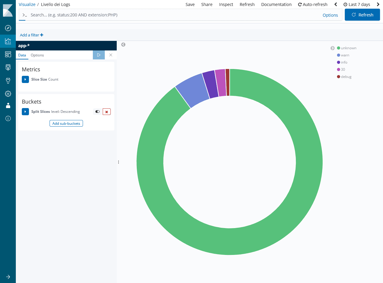 Non è tutto: se volessimo mostrare la percentuale di log per ogni livello, potremmo creare un grafico a torta, che crea dei bucket separati per ogni livello, sfruttando il campo “level” presente nei log: