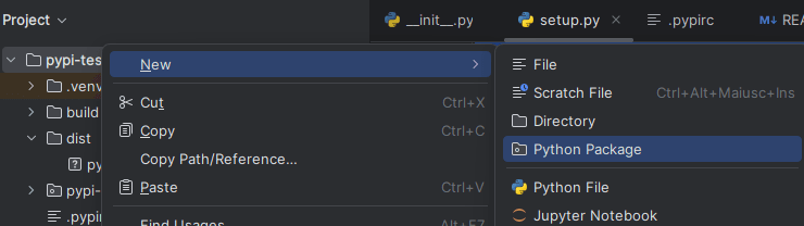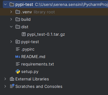 Questo file dev’essere inserito nella cartella principale del progetto: nel caso di esempio, questo va inserito nella cartella pypi-test principale.