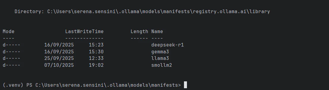 Quando invece eseguiamo il pull di un modello, viene scaricato quello che si chiama manifest, che contiene tutte le informazioni necessarie per eseguire il modello, come i layer, i pesi, e le configurazioni. Queste informazioni vengono salvate in una directory locale, tipicamente in ~/.ollama/models/. Il formato del file manifest è simile a quello di Docker, e permette a Ollama di gestire efficientemente i modelli, evitando di scaricare nuovamente i layer già presenti.